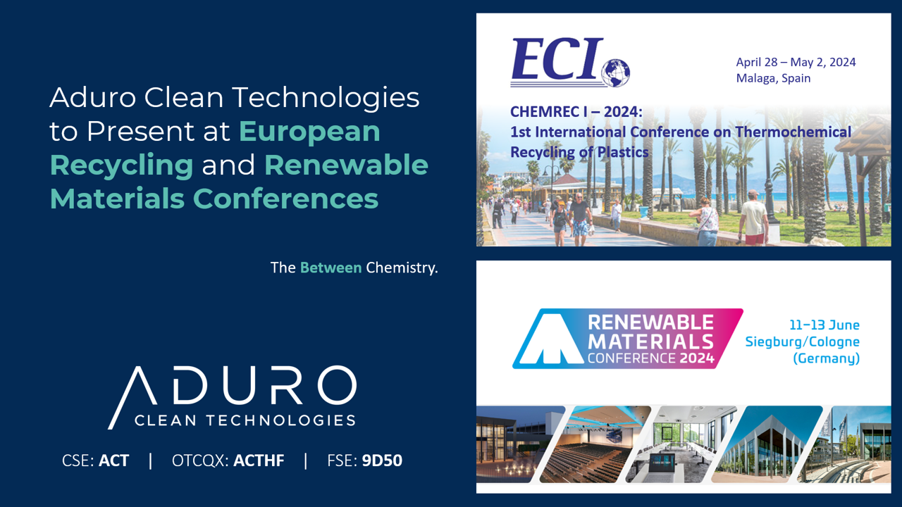 LONDON, Ontario, April 11, 2024 (GLOBE NEWSWIRE) -- Aduro Clean Technologies Inc. (“Aduro” or the “Company”) (CSE: ACT) (OTCQX: ACTHF) (FSE: 9D50), a Canadian technology company using the power of chemistry to transform lower value feedstocks, like waste plastics, heavy bitumen, and renewable oils, into resources for the 21st century, is pleased to announce its participation at two industry conferences focused on the advancement of advanced chemical recycling and renewable materials.