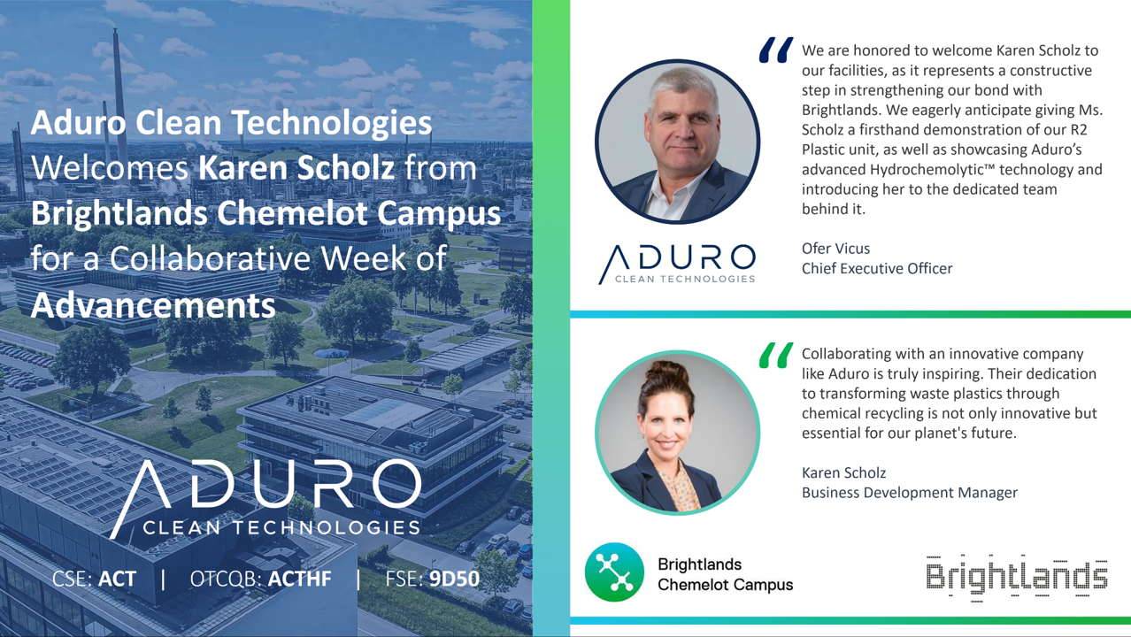 SARNIA, Ontario, Aug. 17, 2023 (GLOBE NEWSWIRE) -- Aduro Clean Technologies Inc. (“Aduro” or the “Company”) (CSE: ACT) (OTCQB: ACTHF) (FSE: 9D50), a Canadian technology company using the power of chemistry to transform lower value feedstocks, like waste plastics, heavy bitumen, and renewable oils, into resources for the 21st century, is thrilled to host Karen Scholz from Brightlands Chemelot Campus (“Brightlands”) during the week of August 21, 2023. This visit underscores our strengthening alliance and mutual commitment to sustainable waste plastic recycling solutions.