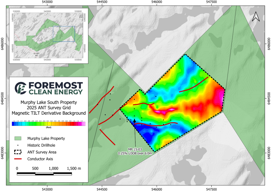 VANCOUVER, British Columbia, July 21, 2025 (GLOBE NEWSWIRE) -- Foremost Clean Energy Ltd. (NASDAQ: FMST) (CSE: FAT) (“Foremost” or the “Company”) is pleased to announce that it has engaged Caur Technologies Inc. (“Caur”), to conduct an ambient noise tomography (“ANT”) survey on the Company’s Murphy Lake South Uranium Property (“Murphy”) located in the world-renowned Athabasca Basin region of northern Saskatchewan. The ANT survey is designed to refine targets along a notable trend of stacked graphitic conductors associated with known unconformity offsets south of MP-15-03 (0.25% U₃O₈ over 6.0 m). Many of the individual conductors within this stacked system remain underexplored. It also aims to generate new targets along east-west and northeast trending structural corridors defined by magnetics and EM, which are largely untested by historical drilling (see figure 1).