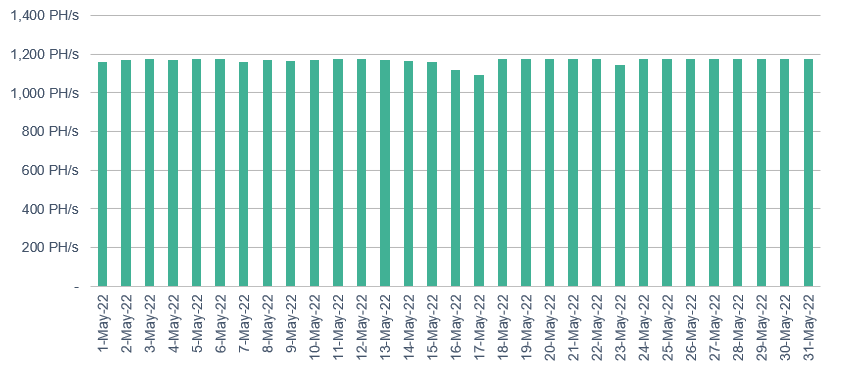 Canal Flats (100% renewable operations since inception6) achieved average monthly operating hashrate in May of 873 PH/s, in line with April (870 PH/s). The project continues to exceed previously announced site capacity of 0.7 EH/s.