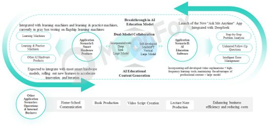 2. Hardware + software integration. Xueersi enhances traditional education hardware by using DeepSeek's deep thinking mode to address the common shortfall of focusing on answers rather than the thinking process. It also develops new AI learning applications that integrate self-developed instructional videos and frequently used AI learning tools, maximizing its accumulated educational content and large model technology advantages. Furthermore, Xueersi is exploring the application of DeepSeek in internal business scenarios, such as improving efficiency and reducing costs in customer service tutoring communications and video script creation.