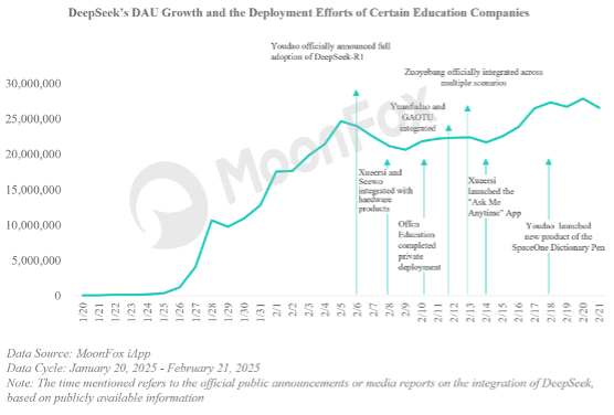 Since the official release of DeepSeek-R1 on January 20, 2025, it has seen rapid and sustained growth in popularity. Alongside a surge in consumer UV, leading education enterprises such as Youdao, Xueersi, Seewo, and Offcn Education have announced their adoption of DeepSeek. They are either integrating their existing AI-powered educational products with DeepSeek for capability and feature upgrades or using DeepSeek as a foundational model to launch new AI-driven educational applications and intelligent learning hardware. This strategic adoption positions them to seize the innovation opportunities brought by DeepSeek model in a short term.