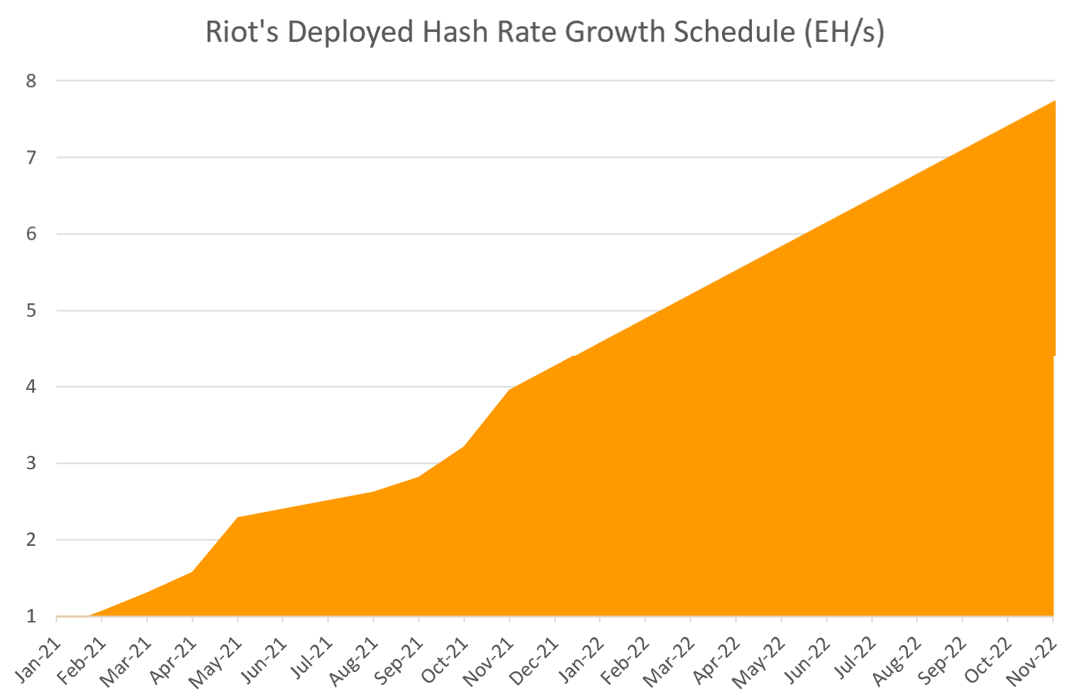 During Q4 2022, Riot anticipates achieving a total hash rate capacity of 7.7 EH/s, assuming full deployment of its anticipated fleet of approximately 81,146 Antminers acquired from Bitmain, 95% of which will be the latest generation S19 series model of miners. When fully deployed, the Company’s total fleet is expected to consume approximately 257.6 MW of energy with an overall hash rate efficiency of 33 joules per terahash (J/TH). This demonstrates Riot’s commitment to being a market leader by building one of the largest and most efficient Bitcoin mining fleets in the industry.