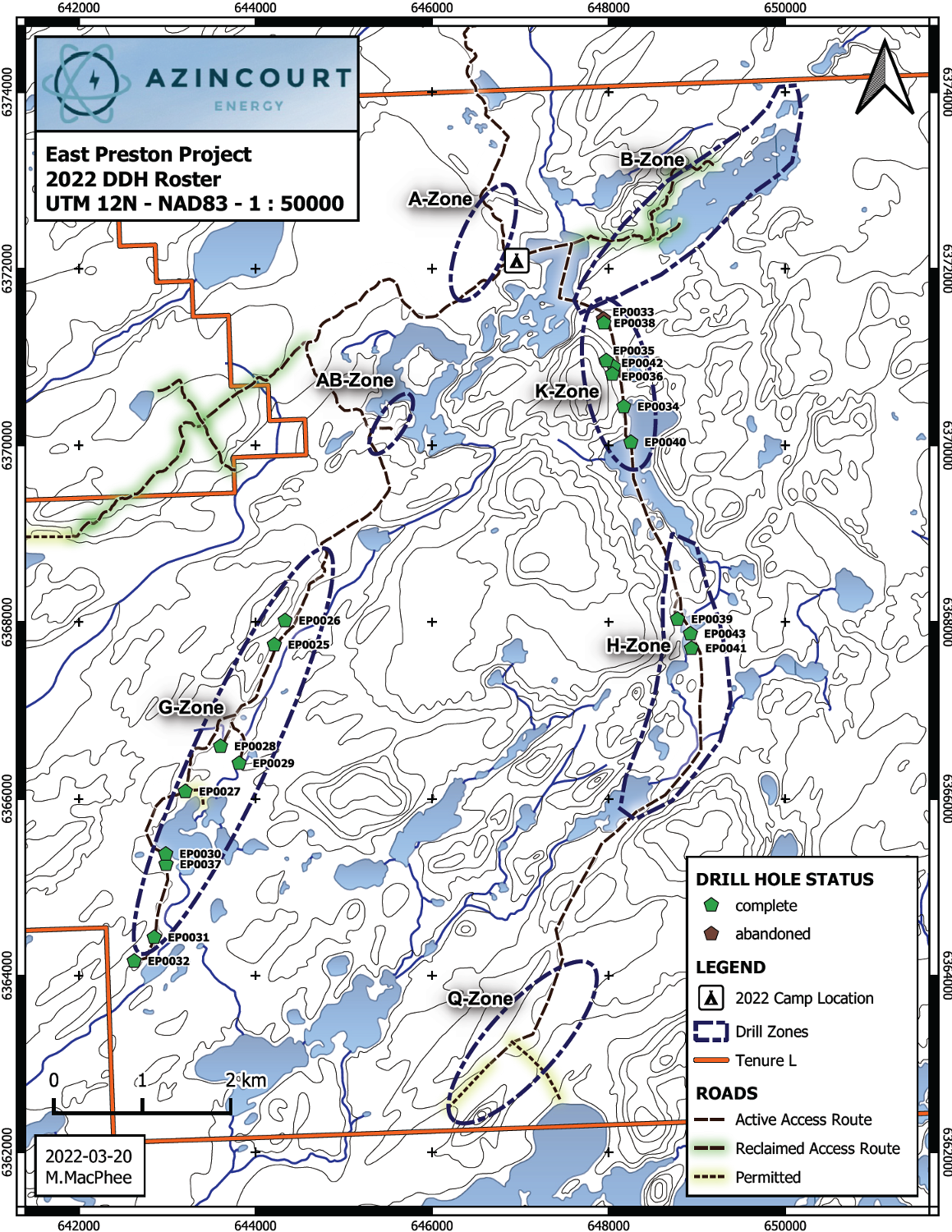 Drilling for the 2022 winter season at the East Preston Project resulted in 5,004.5 meters completed in 19 drill holes between January and March of 2022. Preliminary results of this program were reported in a news release dated March 29th, 2022. Drilling during the 2022 program focused on the A-G and K-H-Q trends and commenced in the G-Zone where the 2021 drill program ended (Figure 3).