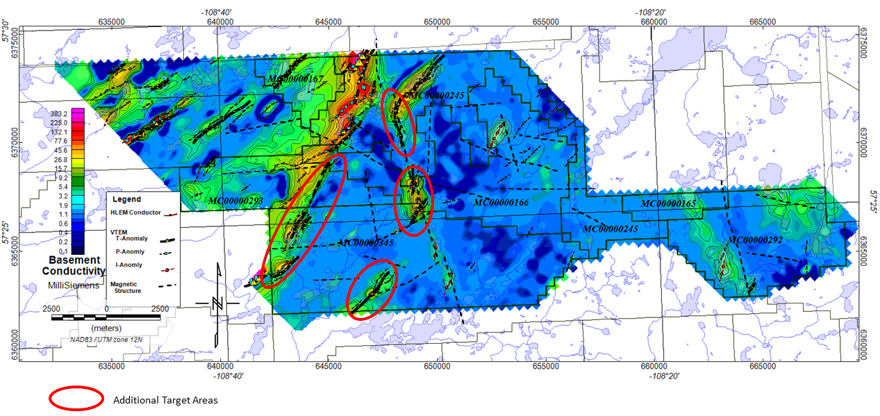 The targets are basement-hosted unconformity related uranium deposits similar to NexGen’s Arrow deposit and Cameco’s Eagle Point mine. East Preston is near the southern edge of the western Athabasca Basin, where targets are in a near surface environment without Athabasca sandstone cover – therefore they are relatively shallow targets but can have great depth extent when discovered. The project ground is located along a parallel conductive trend between the PLS-Arrow trend and Cameco’s Centennial deposit (Virgin River-Dufferin Lake trend).