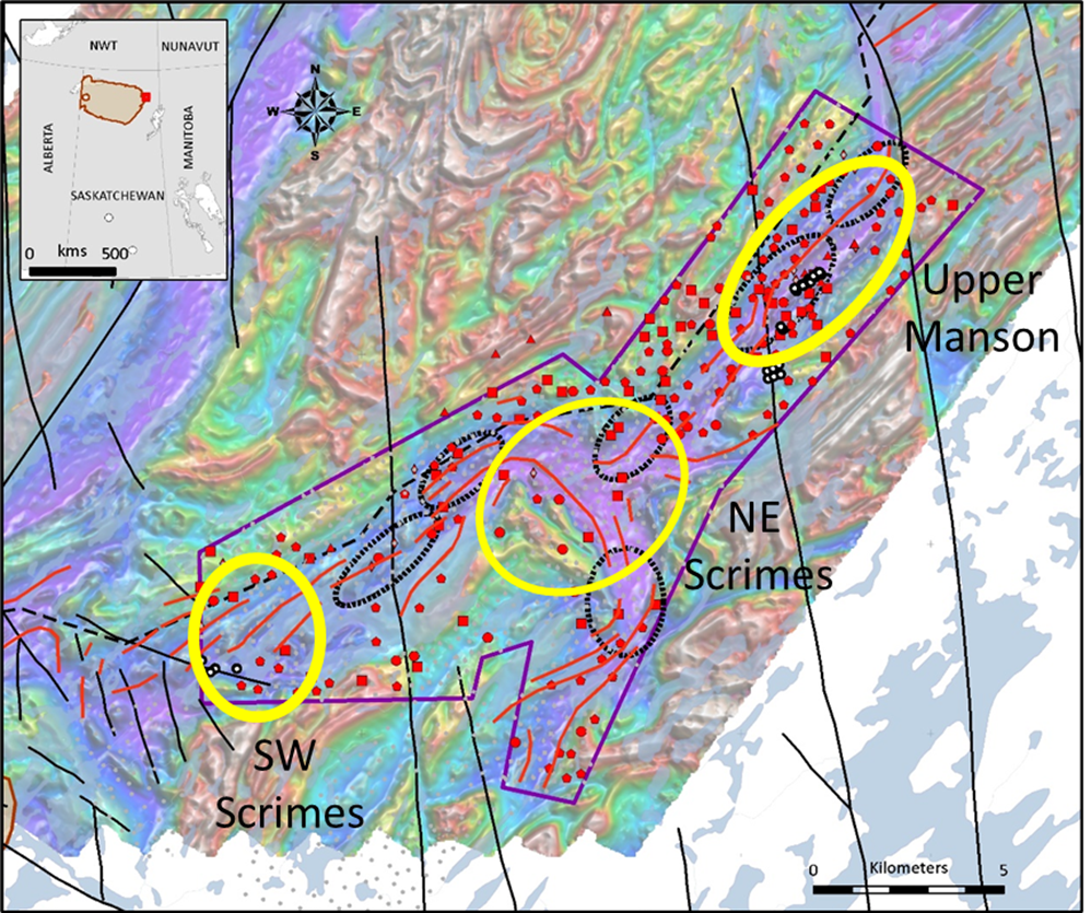 Three target areas have been selected on the Hatchet Lake property for initial work. (Figure 5) The priority drill targets are the SW Scrimes and Upper Manson areas, which are considered drill ready once some initial ground reconnaissance is completed. Drilling will focus on conductive packages with associated radioactive boulders to identify and vector towards potential sources for said boulders.