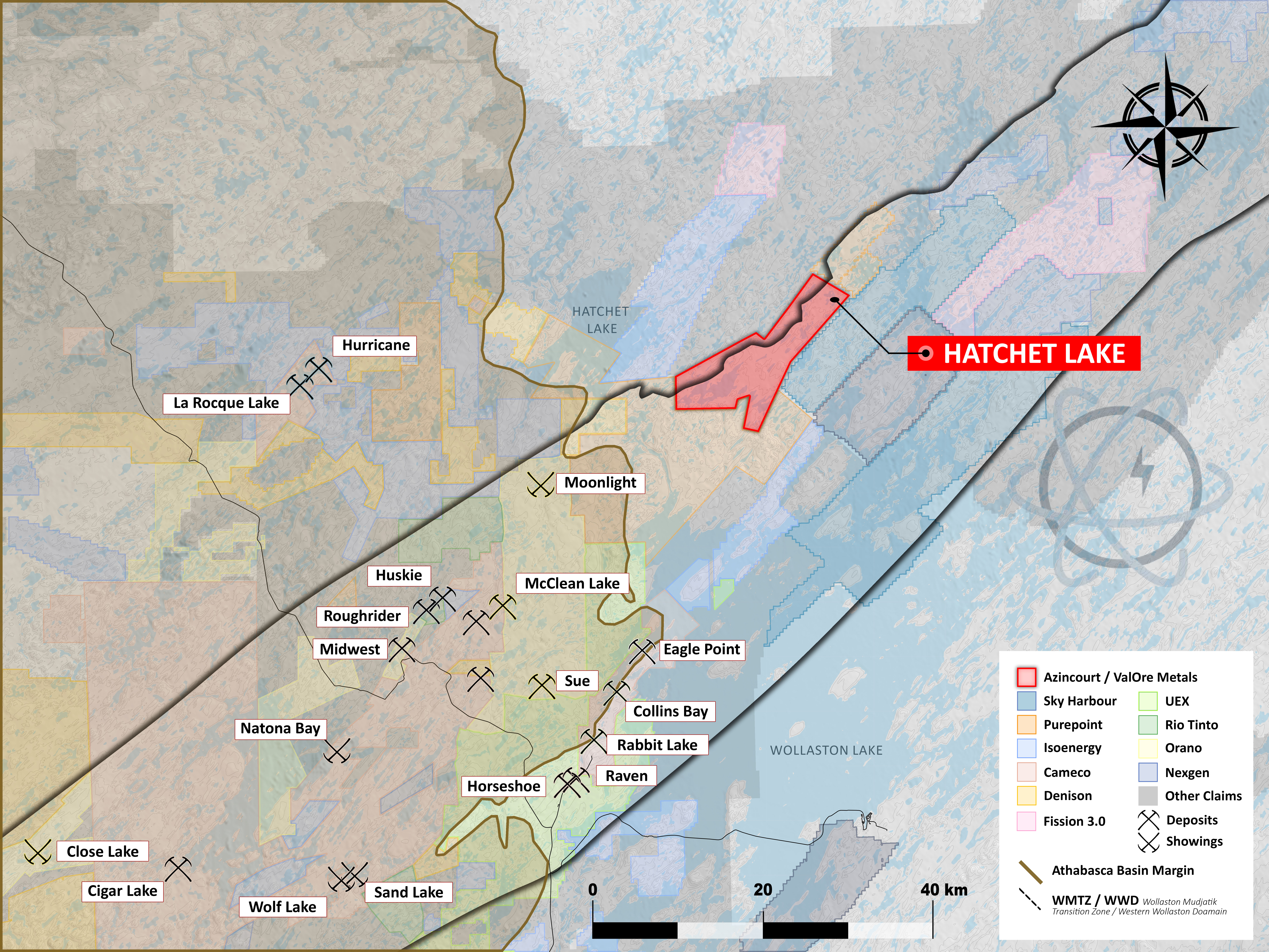 Azincourt entered into an option agreement with ValOre Metals Corp. on November 9th, 2021, to earn up to a 75% interest in the Hatchet Lake property. Previous work on the property identified multiple, shallow, unconformity-related basement uranium targets. Previous work includes diamond drilling, geophysics, boulder, soil, lake sediment and bio-geochemical sampling. The project contains substantial historic exploration datasets with identified uranium anomalism and showings to help guide exploration programs. Historical operators include Gulf Minerals, Saskatchewan Mining and Development Corp, Hathor Exploration Ltd., and Rio Tinto.