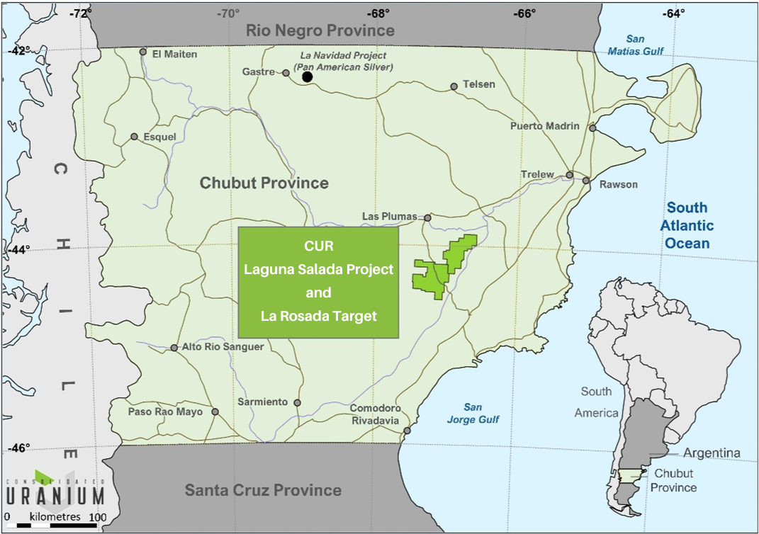 TORONTO, Feb. 23, 2023 (GLOBE NEWSWIRE) -- Consolidated Uranium Inc. (“CUR”, the “Company”, “Consolidated Uranium”) (TSXV: CUR) (OTCQB: CURUF) is pleased to report encouraging Uranium and Vanadium assay results from its 2022 regional field program at its 100% owned Laguna Salada Uranium-Vanadium Project (“Laguna Salada” or the “Property”) located in Chubut Province, Argentina (Figure 1).
