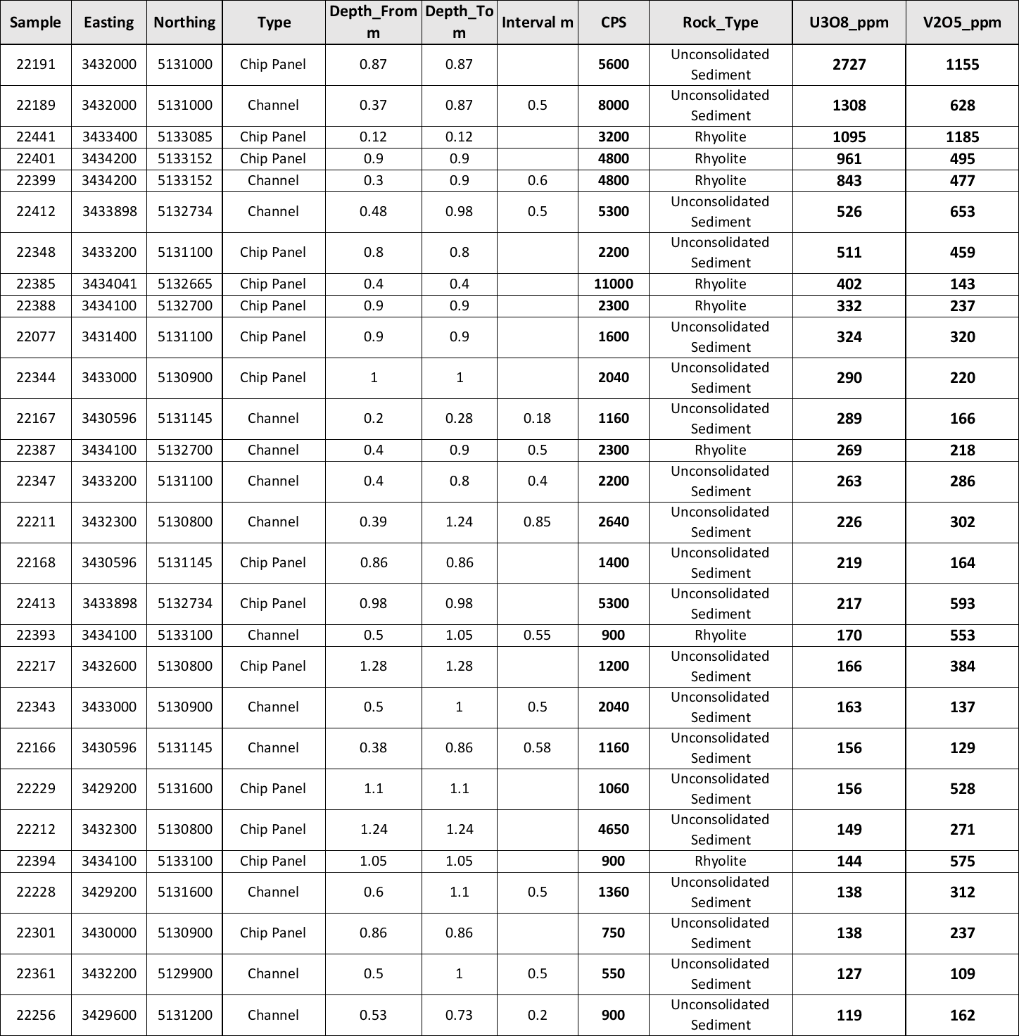 Of the 428 soil samples taken, values ranging from <10ppm to 2,727 ppm U3O8, from 8 to 1,489 ppm V2O5, and means of 55 ppm U3O8 and 230 ppm V2O5 respectively were returned (Table 1).