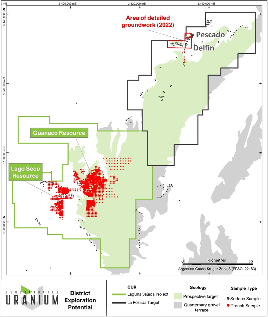 Philip Williams, Chairman and CEO of Consolidated Uranium commented, “We are pleased to report the results of the 2022 field program at La Rosada, situated approximately 40 kilometers northeast of the Laguna Salada Uranium-Vanadium historic mineral resource area. Excellent community relations work with the landholders in the area by our team has permitted the execution of a systematic scintillometry and soil geochemistry program, the results of which have confirmed the presence of Uranium and Vanadium mineralization at shallow depths and over wide areas, ranking the area as a highly prospective target. The work program also furthered our understanding of the nature of and controls on mineralization, which will be useful in guiding future exploration programs on the broader Property area. We acquired the Laguna Salada project based on its attractive development characteristics, near surface mineralization in unconsolidated gravels, as well as its location in a jurisdiction with existing nuclear reactors and historic uranium mining. The program confirmed our belief that the potential for scale at the Property exists elevating it within our portfolio, further work programs for 2023 are now being planned.”