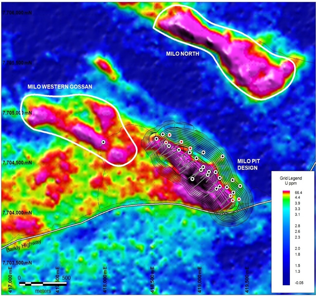 Exploration potential at Milo is considered to be very good. Much of the previous work at Milo including the bulk of drilling has been directed at The Milo Gossan. A similar gossan occurs immediately to the west (Milo Western Gossan) and is over 1 kilometre long. It has a similar Radiometric signature to Milo. In addition, a further large untested radiometric anomaly occurs approximately 1 kilometre to the North (Milo North) which has the largest radiometric anomaly on the tenement. Previous work has focused on the rare earth potential of the project rather than the Uranium potential.