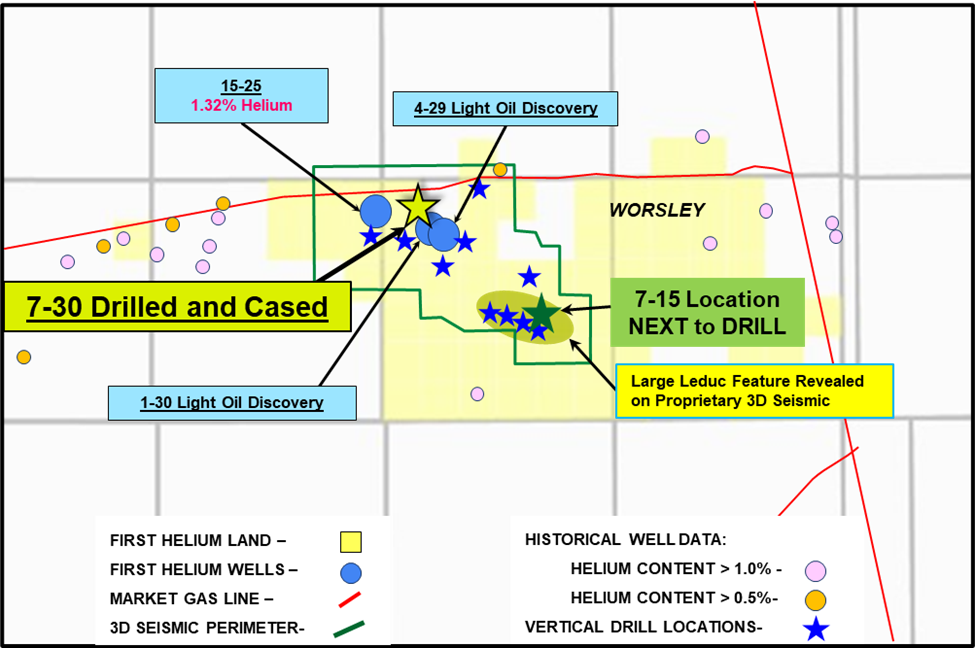 "We are excited to be drilling our high impact Leduc anomaly, 7-15, which on seismic is approximately 5X the areal extent of our successful 1-30 light oil pool discovery. Favorable results from this well will further de-risk our Leduc Play, where we have identified 10 additional primary locations on proprietary 3D seismic, and potential for further southeast extension across our 100% owned lands," said Ed Bereznicki, President & CEO of First Helium. "With this next drill, we are also excited about continuing to evaluate the multi-zone potential across our Worsley land base. Success in these stacked zones could provide meaningful additional value for our shareholders from multiple formations and commodities," added Mr. Bereznicki.