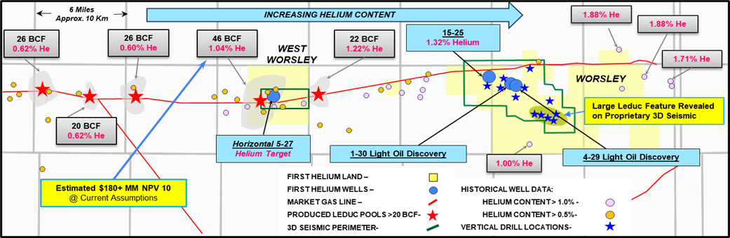 The Company’s Worsley Property encompasses more than 53,000 acres of 100% owned land along a trend of sizeable, past producing helium enriched natural gas pools (See Figure 1). This includes the 15-25 helium discovery well, with an independently evaluated resource of 323 million cubic feet of helium1,2, along with numerous multi-zone targets for helium, oil, and natural gas.