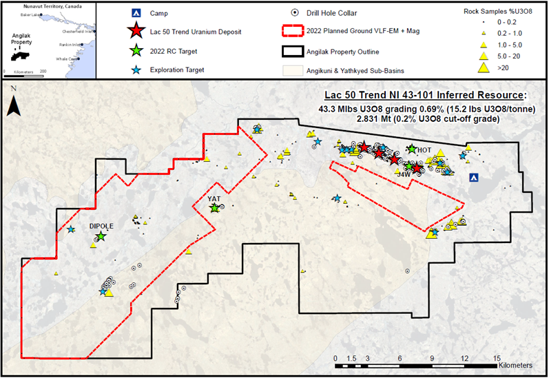 ValOre’s Vice President Exploration, Colin Smith, stated: “CAD$85M of historical expenditures at Angilak, CAD$55M of that by ValOre between 2009 – 2016, served to generate the Lac 50 resource estimate, which is supported by 335 drill holes (60,258 m). The substantial prior investment will be fully leveraged in 2022, with this year’s comprehensive program designed to further demonstrate and rapidly advance the district-scale resource potential of this prolific uranium, base and precious metals property with ~8,000 m of project-wide drilling, ~2,400 ln-km of ground VLF-EM and magnetics, and multi-faceted geochemistry programs.”