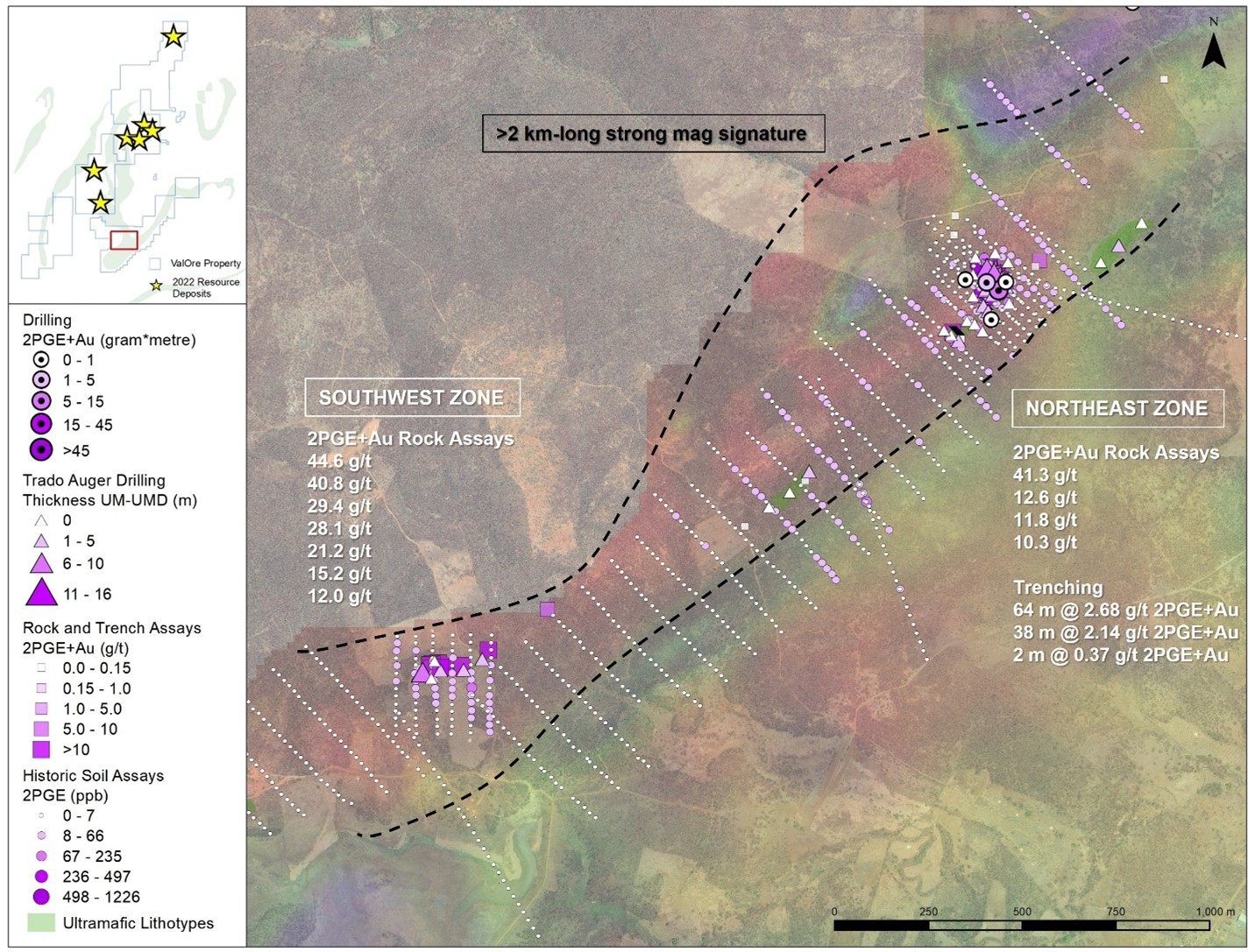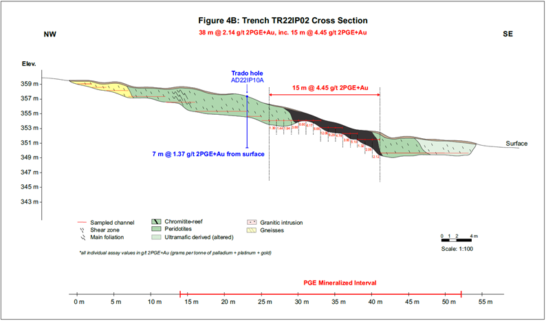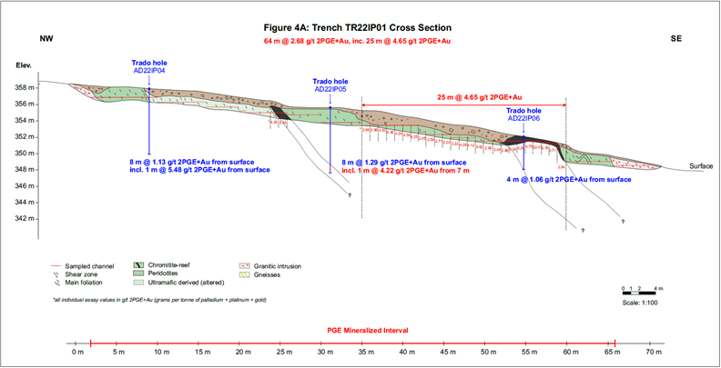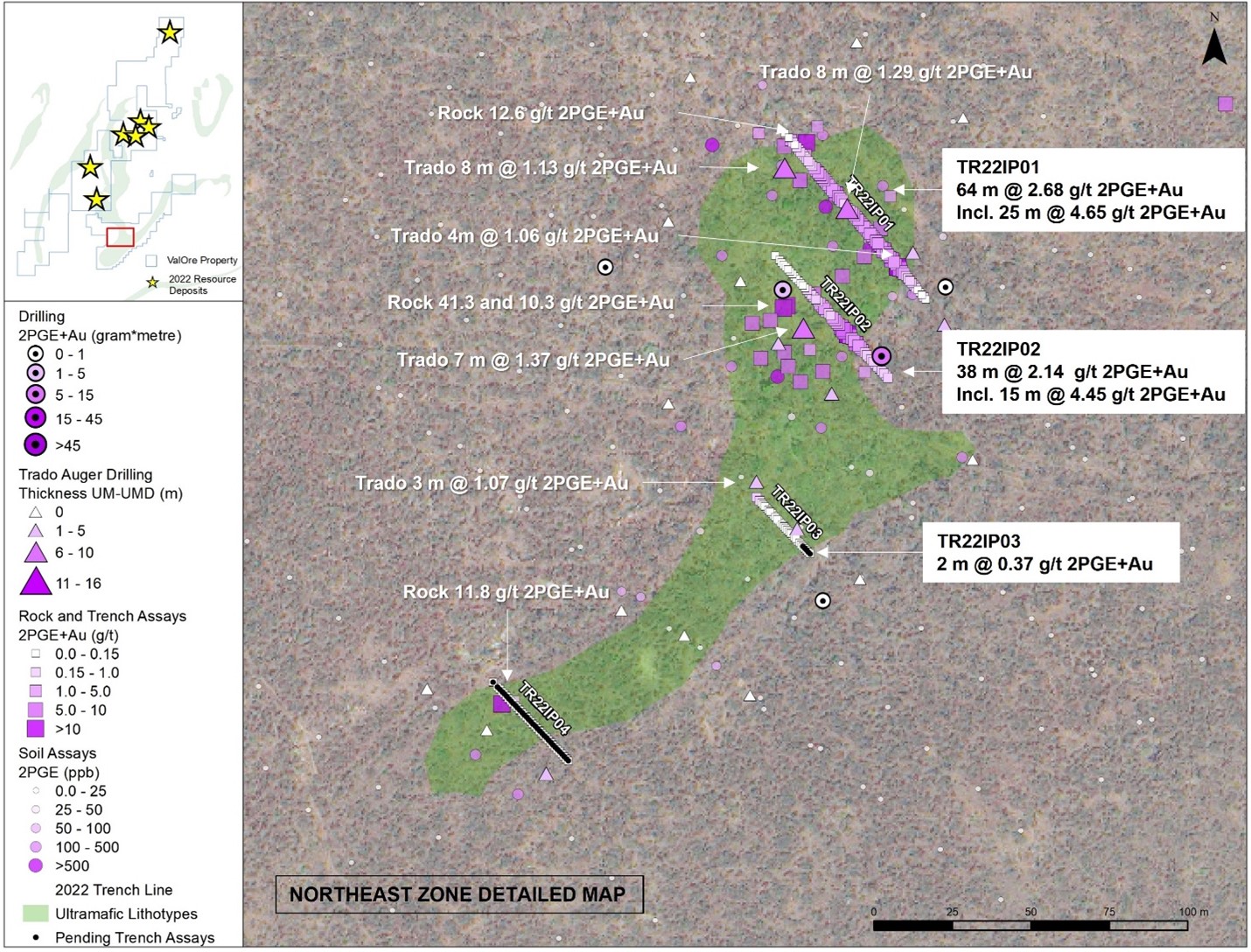 PGE-mineralized Trado® auger results defined an area of focus within the Northeast Zone for priority follow up work, and was subsequently tested for in-situ PGE mineralization by excavation of 4 trenches totaling 189 m, covering a strike length of approximately 200 m. All 4 trenches confirmed UM and UM-derived rocks continuity along strike, with PGE mineralization reported in 3 of 4 trenches. Assays remain pending for trench TR22IP04.