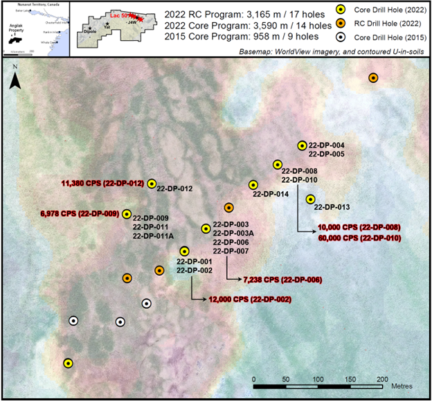 The Dipole and J4 West target areas warranted follow-up drilling due to strong radioactive intercepts in 22 of 27 holes in the spring 2022 RC drill program.