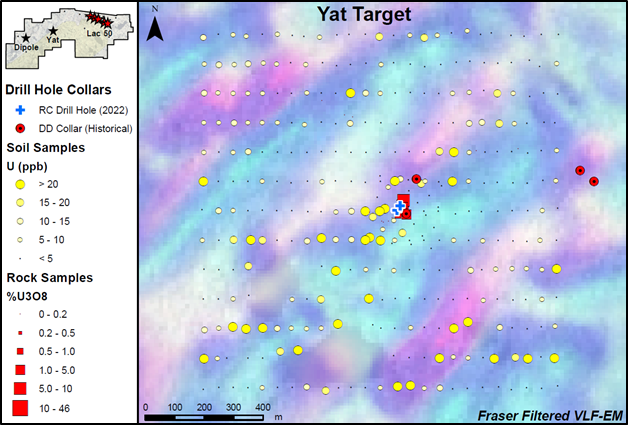 Figure 3: Plan map regional Yat target area, showing uranium-in-soils anomaly, coincident VLF-EM conductor, high-grade rock samples, and drilling.