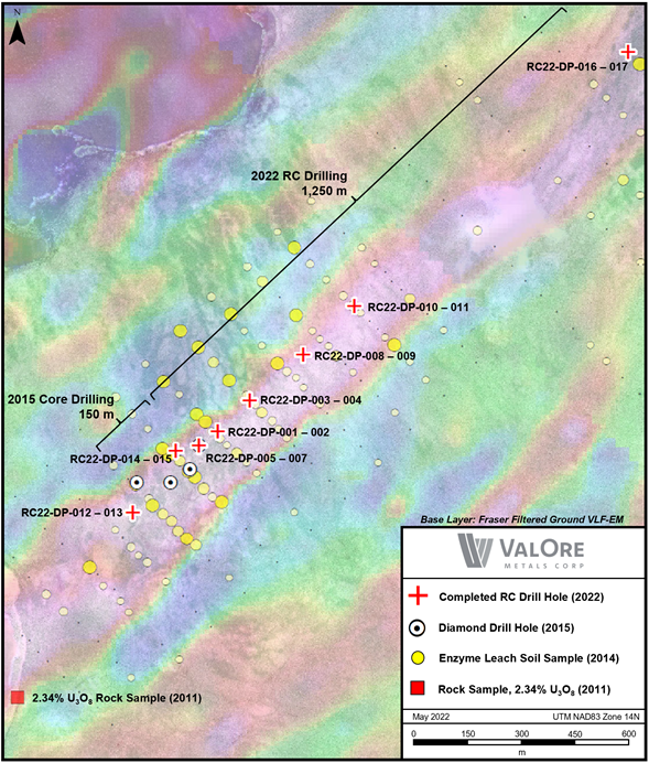 One regional reconnaissance RC drill pad was located 1,250 m to the northwest of the main zone, where two 2022 holes were drilled. Both RC22-DP-016 and -017 only returned background radioactivity values, and thus will not receive follow-up. For more information regarding the Dipole target, CLICK HERE for news release dated May 9, 2022, and CLICK HERE for news release dated October 19, 2015.