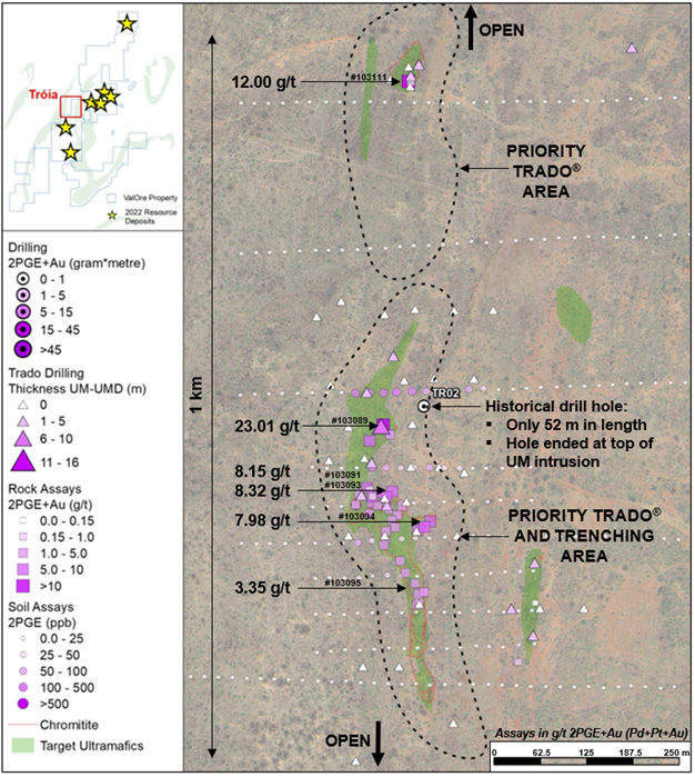 “The Tróia target has excellent exploration upside, as evidenced by the high-grade palladium-platinum values from the initial outcrop and grab sample assay results released today,” stated ValOre’s VP of Exploration, Colin Smith. “The 1-kilometre-long trend is fully open along strike to in both directions and remains largely untested at depth. Detailed mapping, Trado® drilling and trenching will further delineate this broad, high-grade, shallow intrusion, with the intention of advancing Tróia into a high priority drill target.”
