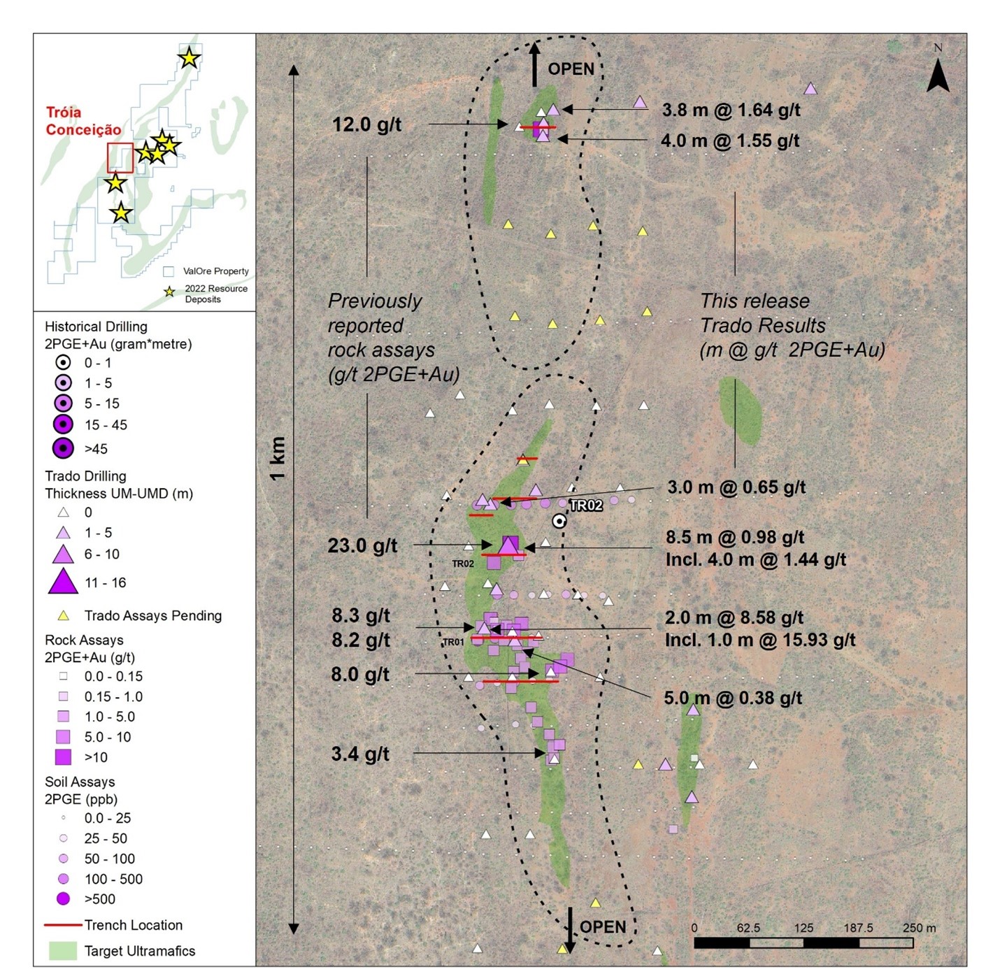 “The Tróia target represents another high-quality, near-surface zone of significant scale that is rapidly evolving into a compelling drill target,” stated ValOre’s VP of Exploration, Colin Smith. “Palladium and platinum mineralization occurs within a broad zone along a 1-kilometre trend that remains open in both directions of strike.”