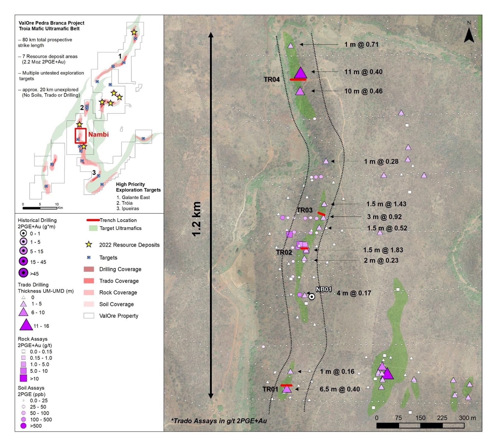 The Nambi target area, situated just a few kilometres from the 2022 NI 43-101 inferred resource areas of Trapia and Massapê (see Figure 1), is characterized by historical geophysical (magnetic high) and geochemical anomalies (PGE-in-soils and rock samples >7 g/t 2PGE+Au). ValOre conducted detailed geological mapping and prospecting along the anomalous trend and subsequently followed up with 75 Trado® auger holes totaling 178 m. At-surface, ultramafic (“UM”) or UM-derived rocks were intercepted in 30 of 75 Trado® holes, with significant PGE mineralization reported in 12 of the 30 UM-bearing Trado® holes, defining a PGE-mineralized trend of 1.2 km.