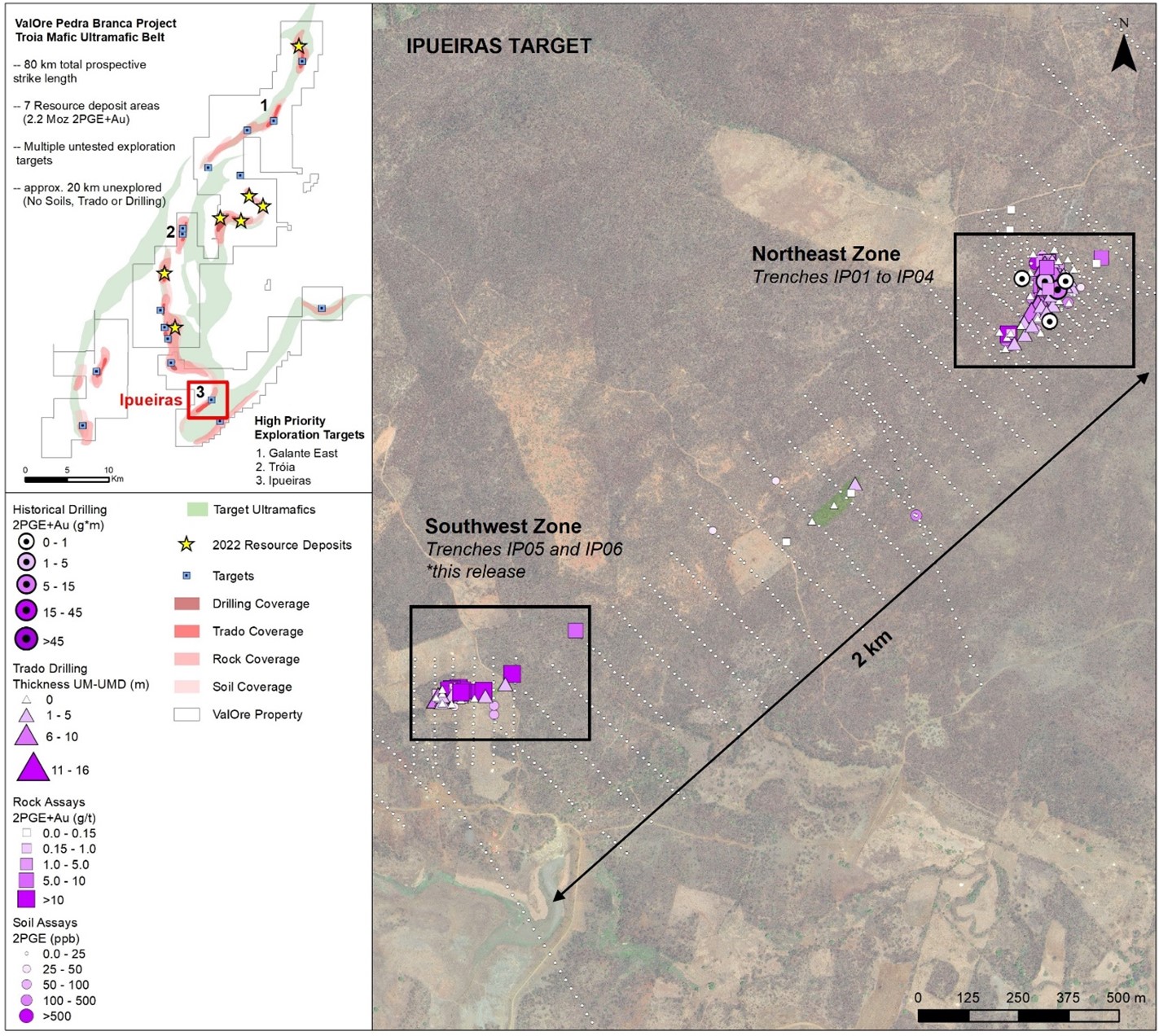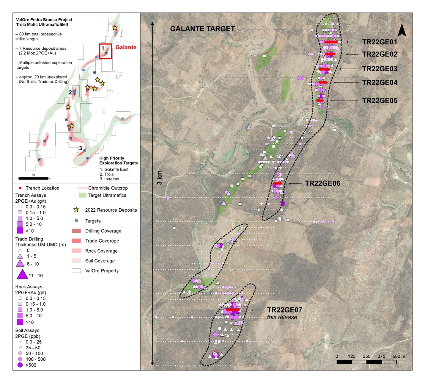 “The final trench at Galante, and two additional trenches at Ipueiras, returned significant intervals of surface PGE mineralization,” stated ValOre’s VP of Exploration, Colin Smith. “Trench assay results confirm the presence of in-situ PGEs, demonstrate potential continuity of target chromite-bearing ultramafic rocks, and warrant follow-up testing in future drill programs.”