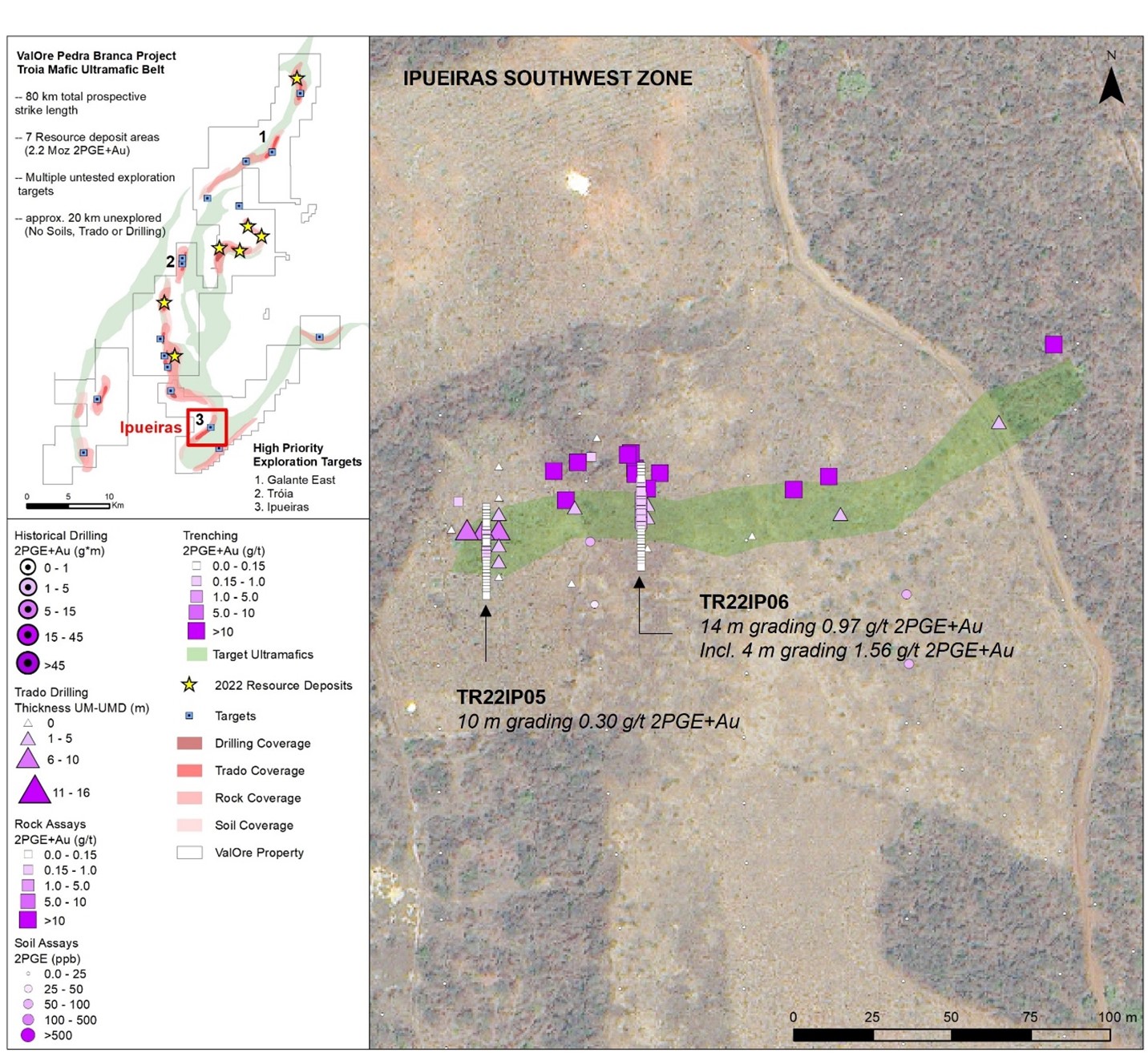 The final trench assay results reported herein, including the final trench at Galante (TR22GE07) and final two trenches at the Southwest Zone at Ipueiras (TR22IP05 and TR22IP06) confirm the presence of in-situ PGE mineralization, demonstrate potential continuity of chromite-bearing ultramafic rocks in both targets, and warrant follow-up testing in future drill programs.