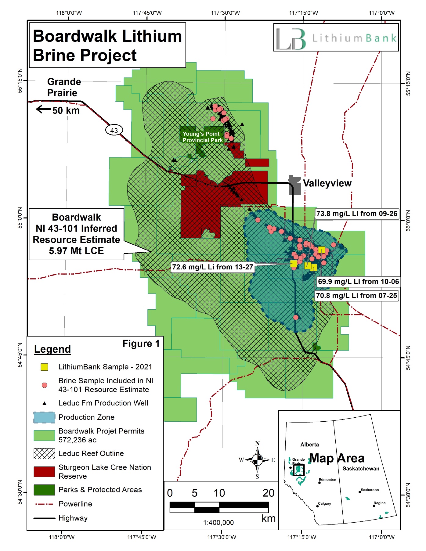 LithiumBank engaged GLJ Ltd. and Fluid Domains Inc. to conduct a hydrogeological study and well network design as part of the Boardwalk Preliminary Economic Assessment (the “PEA”). The study area for the PEA shown as the “Production Zone” in Figure 1 is where the majority of past oil and gas production occurred within the Leduc Formation since the 1960’s. This area was selected because of its past production history providing down hole data from over 400 wells (of the over 550 in the Leduc) and lithium and multi-element assay analysis from 40 of the overall 65 wells within the Leduc Formation.