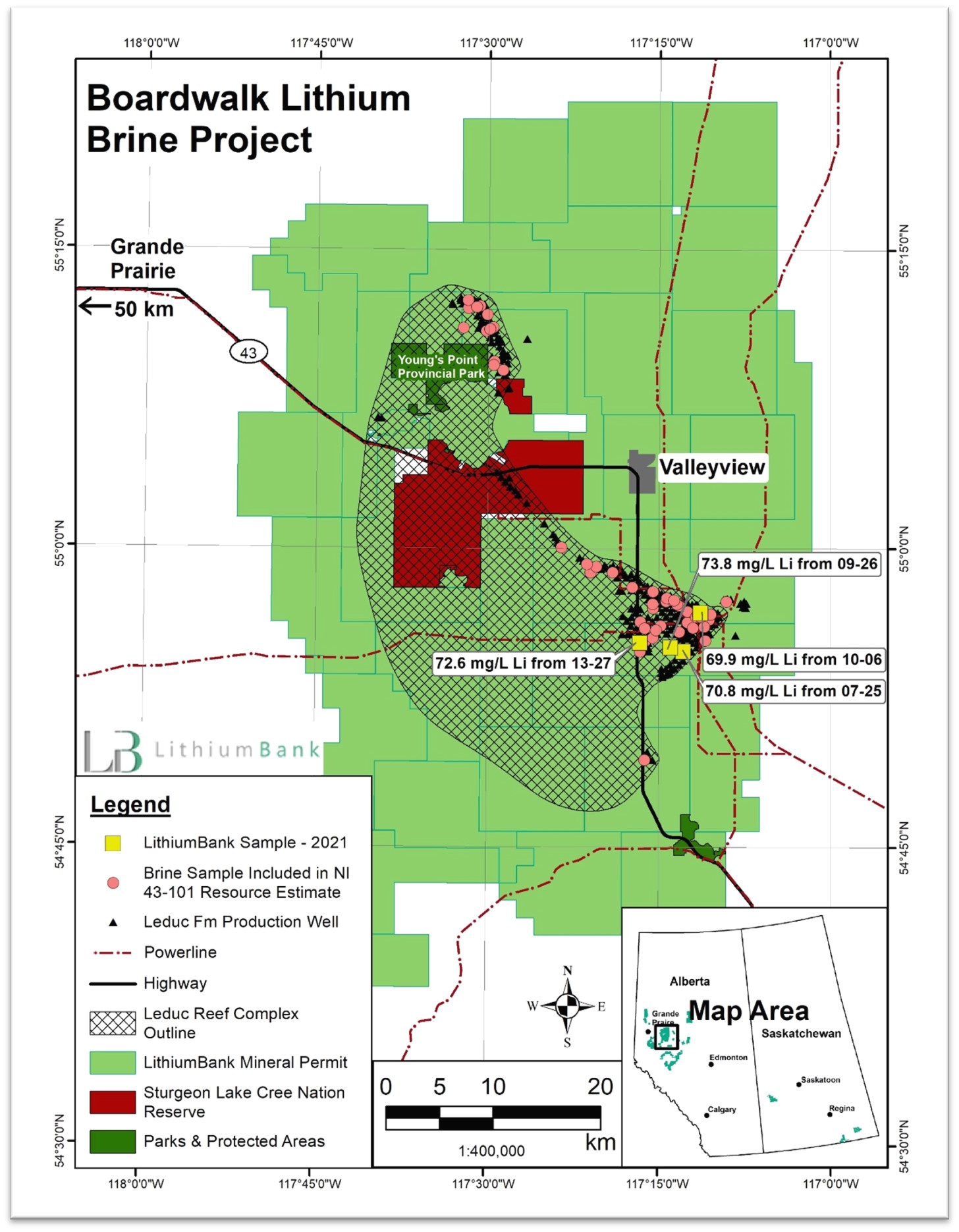 LithiumBank Resources Corp. is an exploration and development company focused on lithium-enriched brine projects in Western Canada where low-carbon-impact, rapid DLE technology can be deployed. LithiumBank currently holds over 3.2 million acres of mineral titles, 2.82M acres in Alberta and 326K acres in Saskatchewan. LithiumBank’s mineral titles are strategically positioned over known reservoirs that provide a unique combination of scale, grade and exceptional flow rates that are necessary for a large-scale direct brine lithium production. LithiumBank is advancing and de-risking several projects in parallel of the Boardwalk Lithium Brine Project.