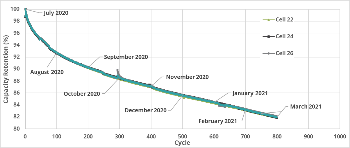 The batteries are tested at a rate of C/3, meaning 3 hours to charge and 3 hours to discharge, hence completing about 4 full cycles per day. The cathode used is of the NMC532 type. Tests are still going on with these batteries to evaluate the full life expectancy of the cells. The CSPG being tested was produced at pilot scale in the Company’s own equipment and in equipment at Corem facilities in Quebec City, Quebec. Tests are still ongoing with these batteries to evaluate the full life expectancy of the cells.