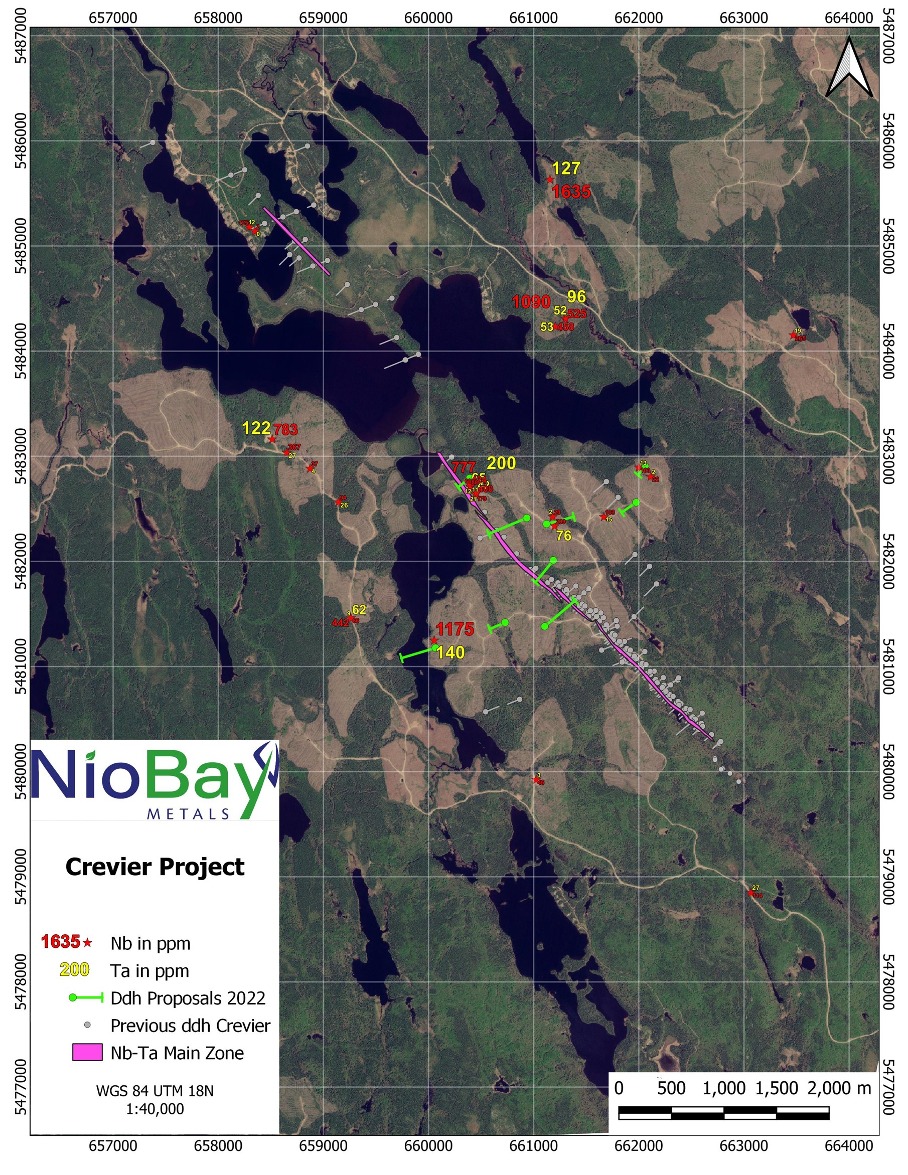 NioBay Metals Inc. (“NioBay” or the “Company”) (TSX-V: NBY) (OTCQB: NBYCF) is pleased to announce the start of a drilling campaign on the Crevier Property, owned by Les Minéraux Crevier Inc., in which NioBay holds a 72.5% interest. Several new drill targets have been identified following assay results of up to 0.30% Nb2O5 and 200 ppm Ta2O5 in newly discovered carbonate boulders and carbonate dykes. These boulders and dykes were identified in the vicinity of topographic lineaments sub-parallel to the Main Zone, within a radius of 0.5 to 2.0 kilometers from the Main Zone. The 43-101 resource estimate for the Main Zone totals 25.4 Mt at 0.20% Nb2O5 and 234 ppm Ta2O5 (Measured and Indicated - SGS July 2010).