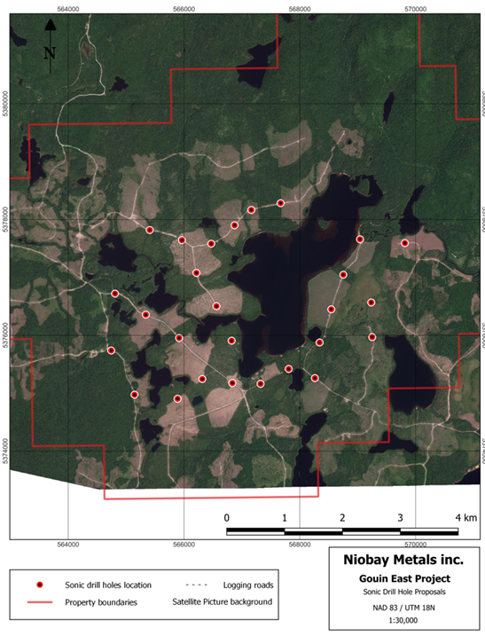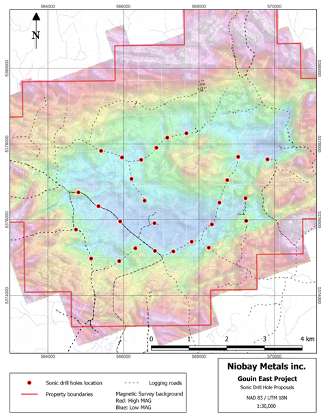 The program will use Sonic drilling technology to sample the entire overburden without disturbing unconsolidated deposits and to recover bedrock core samples of approximately one to two metres. The 30-hole program will detect potential niobium dispersal trains in till up-ice of the surface anomalies and identify/analyze the bedrock where there is no rock outcrop within the magnetic anomaly. The two attached maps (see Figures 1 and 2) show the location of the Sonic holes on a recent satellite picture background and on a view of the total field magnetic survey.