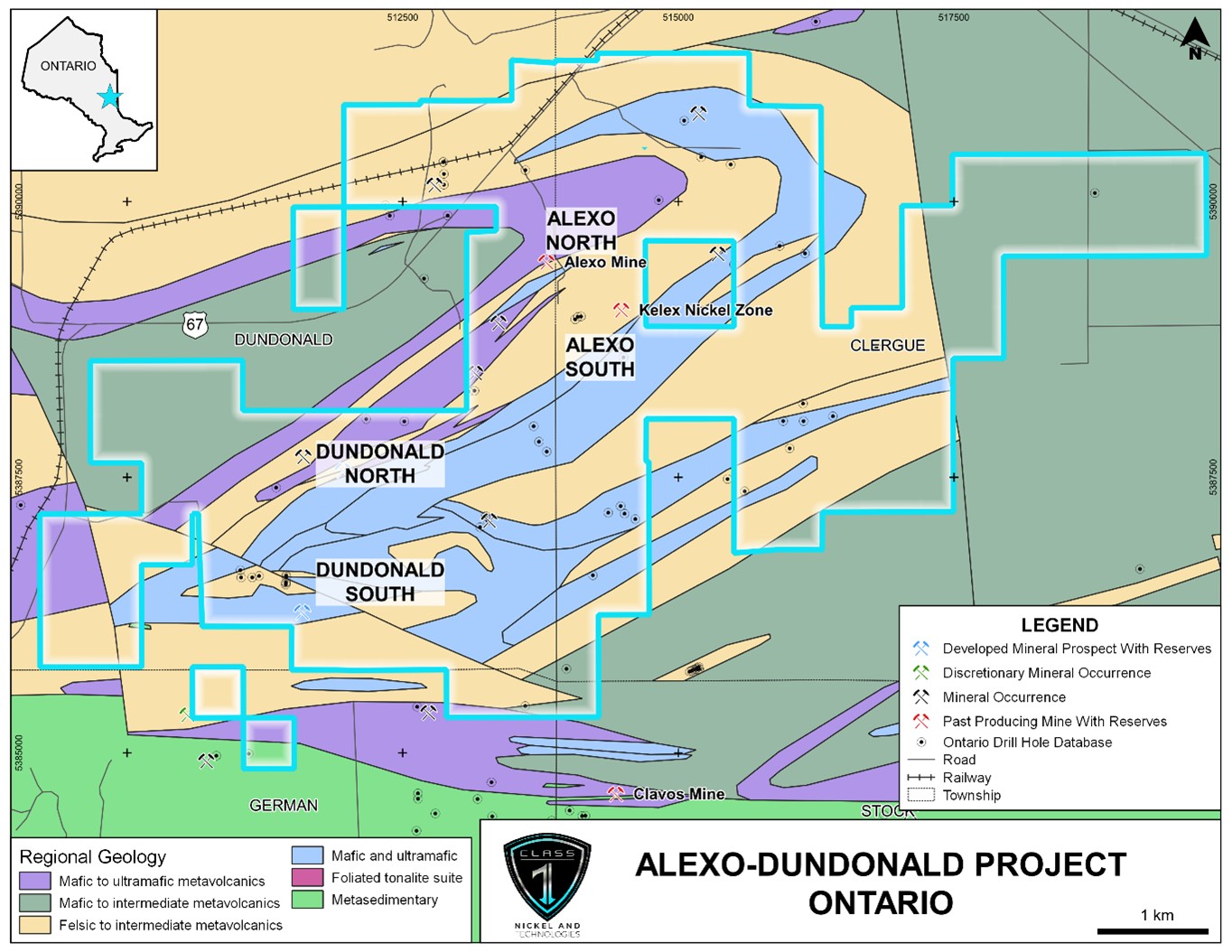 Class 1 Nickel and Technologies Limited (CSE: NICO/OTCQB: NICLF) is a Mineral Resource Company focused on the development of its 100% owned Alexo-Dundonald Property, a portfolio of komatiite hosted magmatic nickel-copper-cobalt sulphide Mineral Resources located near Timmins, Ontario. The Company also owns the Somanike komatiite-hosted nickel-copper sulphide property in Quebec, which includes the famous Marbridge Nickel Mine.