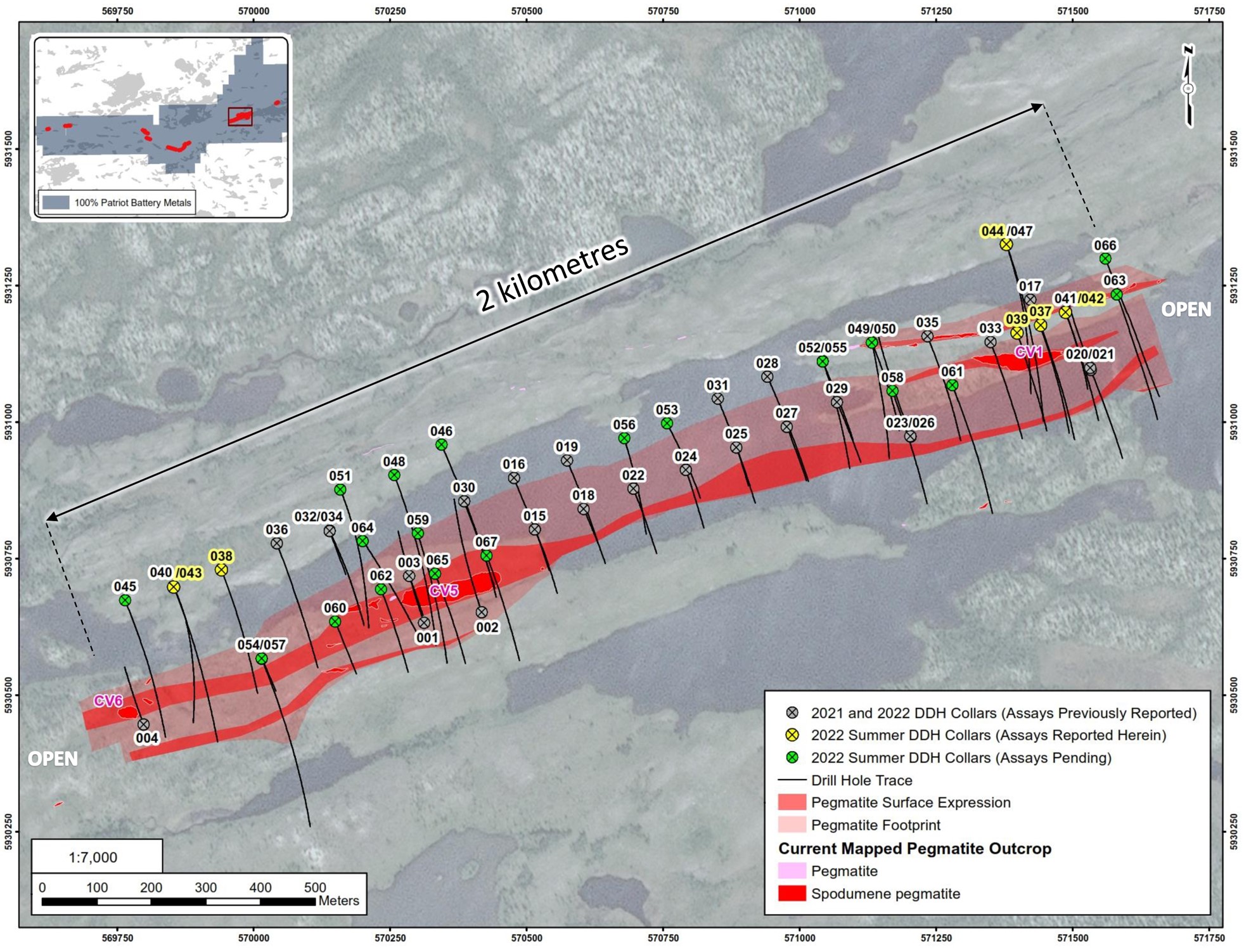 Patriot Battery Metals Inc. (the “Company” or “Patriot”) (TSX-V: PMET) (OTCQB: PMETF) (FSE: R9GA) is pleased to announce core assay results for an additional six (6) drill holes (CV22-037, 038, 039, 042, 043, and 044) completed as part of the summer phase of the 2022 drill campaign at its wholly owned Corvette Property (the “Property”), located in the James Bay Region of Quebec. The target drill area – at the CV Lithium Trend – is located approximately 13.5 km south of the regional and all-weather Trans-Taiga Road and powerline infrastructure.