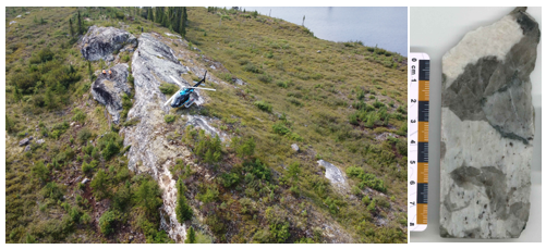 At the Property, including CV5, lithium mineralization is observed to occur within Li-Cs-Ta pegmatites, which may be exposed at surface as isolated high relief ‘whale-back’ landforms (i.e., outcrops) (Photo 1). Given the proximity of some lithium pegmatite outcrops to each other at the various clusters, as well as the shallow till cover, it is probable that some of the outcrops may reflect a discontinuous surface exposure of a single, larger pegmatite ‘outcrop’ subsurface. Further, the high number of well-mineralized pegmatites along the trend at these clusters indicate a strong potential for a series of relatively closely spaced/stacked, sub-parallel, and sizable spodumene-bearing pegmatite bodies, with significant lateral and depth extent, to be present.