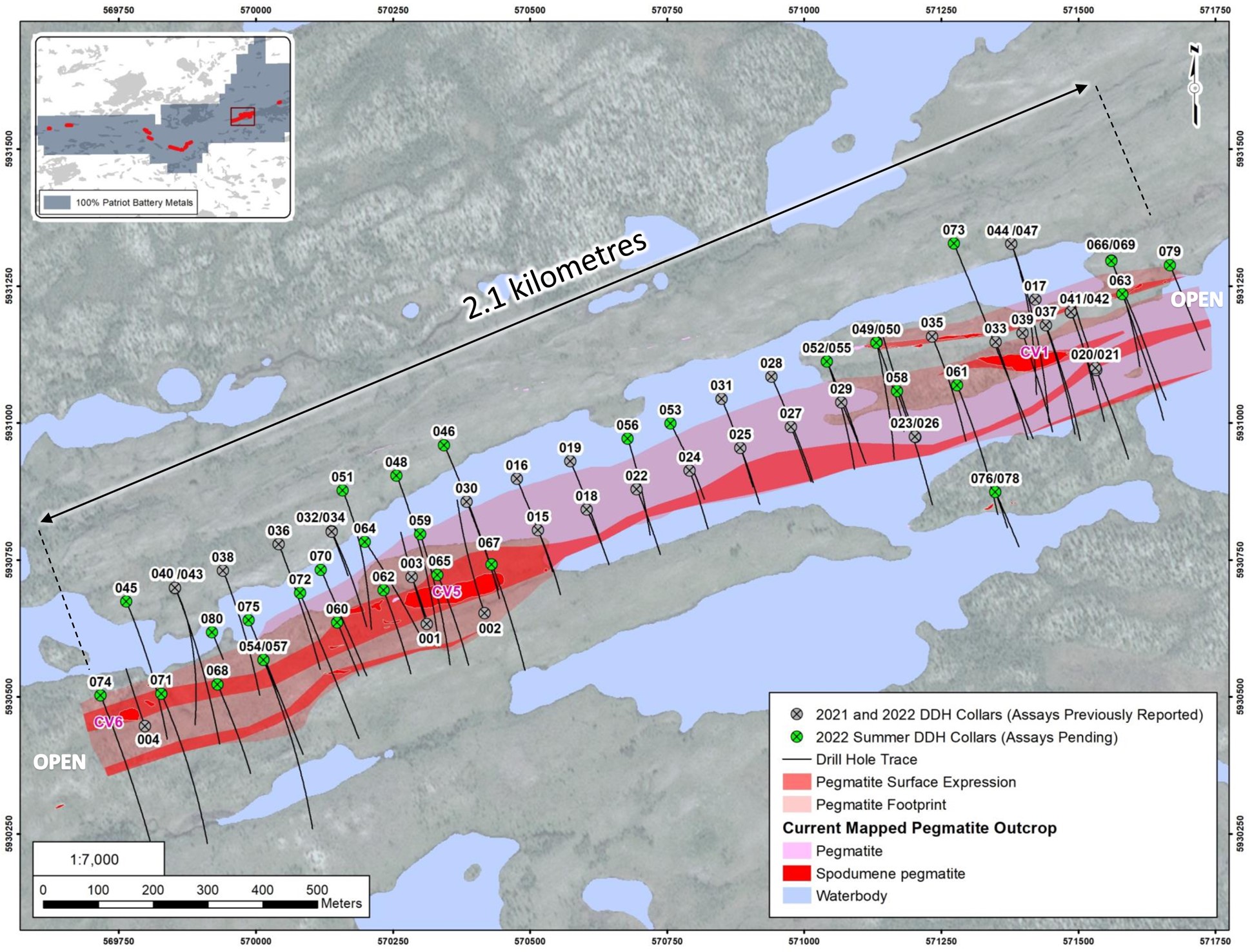 Patriot Battery Metals Inc. (the “Company” or “Patriot”) (TSX-V: PMET) (OTCQB: PMETF) (FSE: R9GA) is pleased to provide an update on the 2022 drill campaign at its wholly owned Corvette Property (the “Property”), located in the James Bay Region of Quebec. The primary drill area is the CV5 pegmatite corridor, located approximately 13.5 km south of the regional and all-weather Trans-Taiga Road and powerline infrastructure with two drills currently coring. The Company has recently positioned the third drill rig at the CV13 pegmatite cluster for initial drill testing.