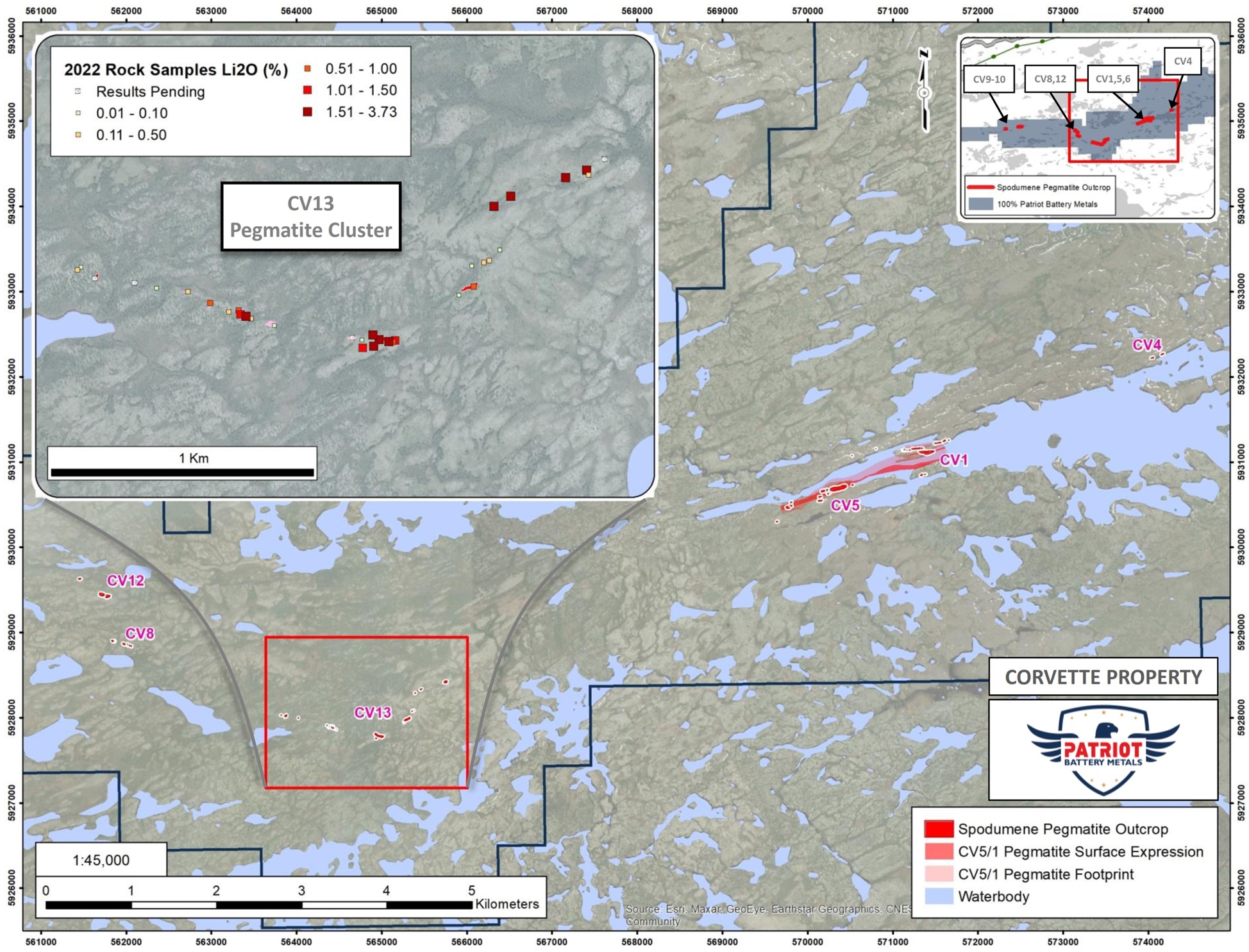 Patriot Battery Metals Inc. (the “Company” or “Patriot”) (TSX-V: PMET) (OTCQB: PMETF) (FSE: R9GA) is pleased to provide an update on the 2022 surface exploration program at the Corvette Property (the ‘Property’) highlighted by the discovery of a new and significant lithium pegmatite cluster (CV13) situated less than 4.5 km from, and on geological trend with, the CV5-1 pegmatite corridor where drilling is currently focused. The new discovery is located central to the Property and approximately 15 km south of the Trans-Taiga all-weather road and powerline infrastructure corridor.