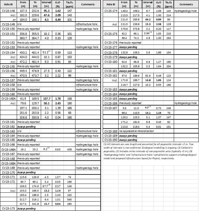 - 95.3 m at 1.62% Li2O (137.3 m to 232.6 m), including 47.6 m at 2.09% Li2O, or 4.1 m at 4.44% Li2O (CV23-148).