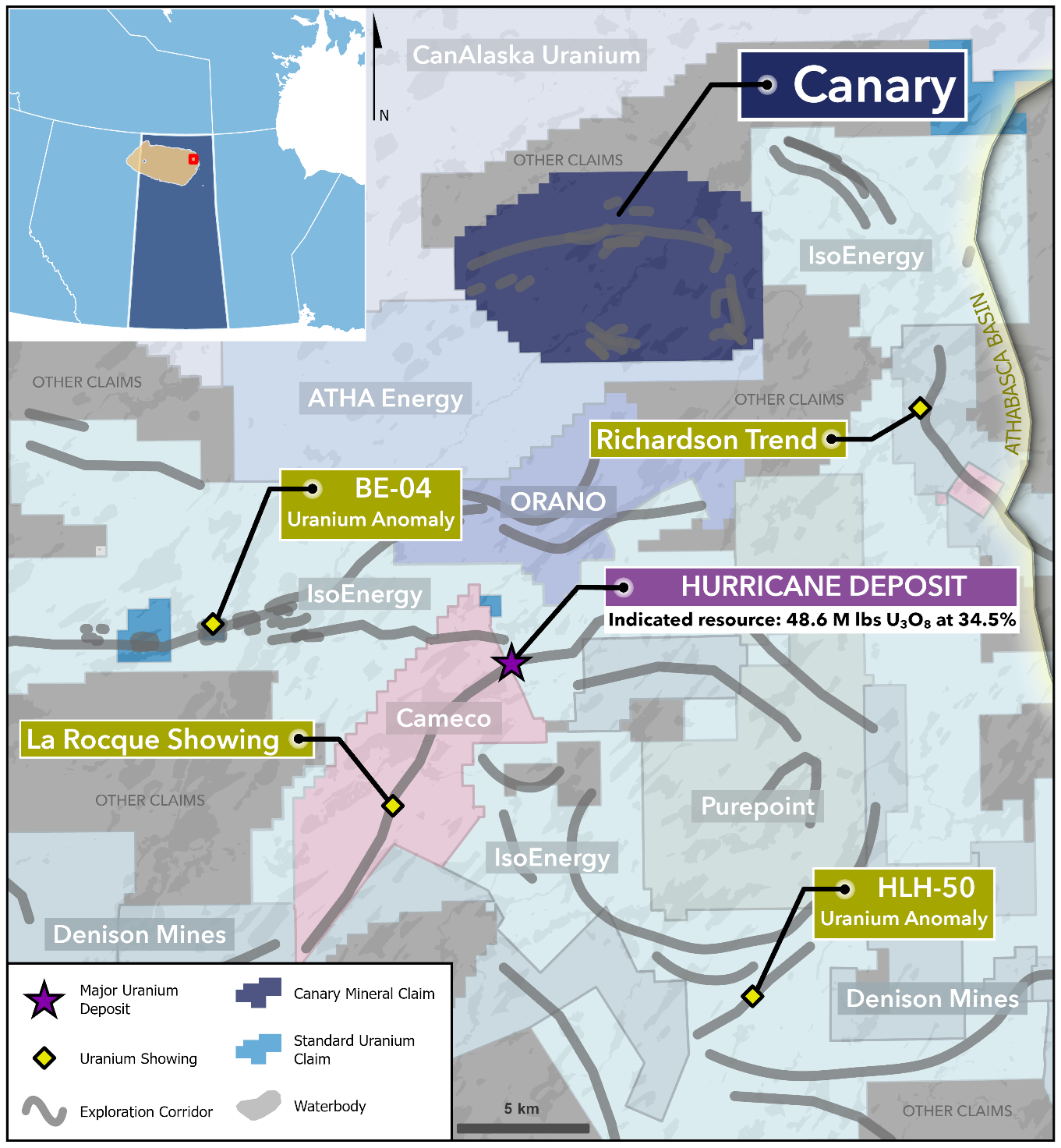 Figure 1. Overview of northeastern Athabasca Basin region, highlighting the Canary Project. Hurricane Deposit Indicated Resource from IsoEnergy Ltd. Technical Report on the Larocque East Project, Northern Saskatchewan, Canada. Dates July 8, 2022.