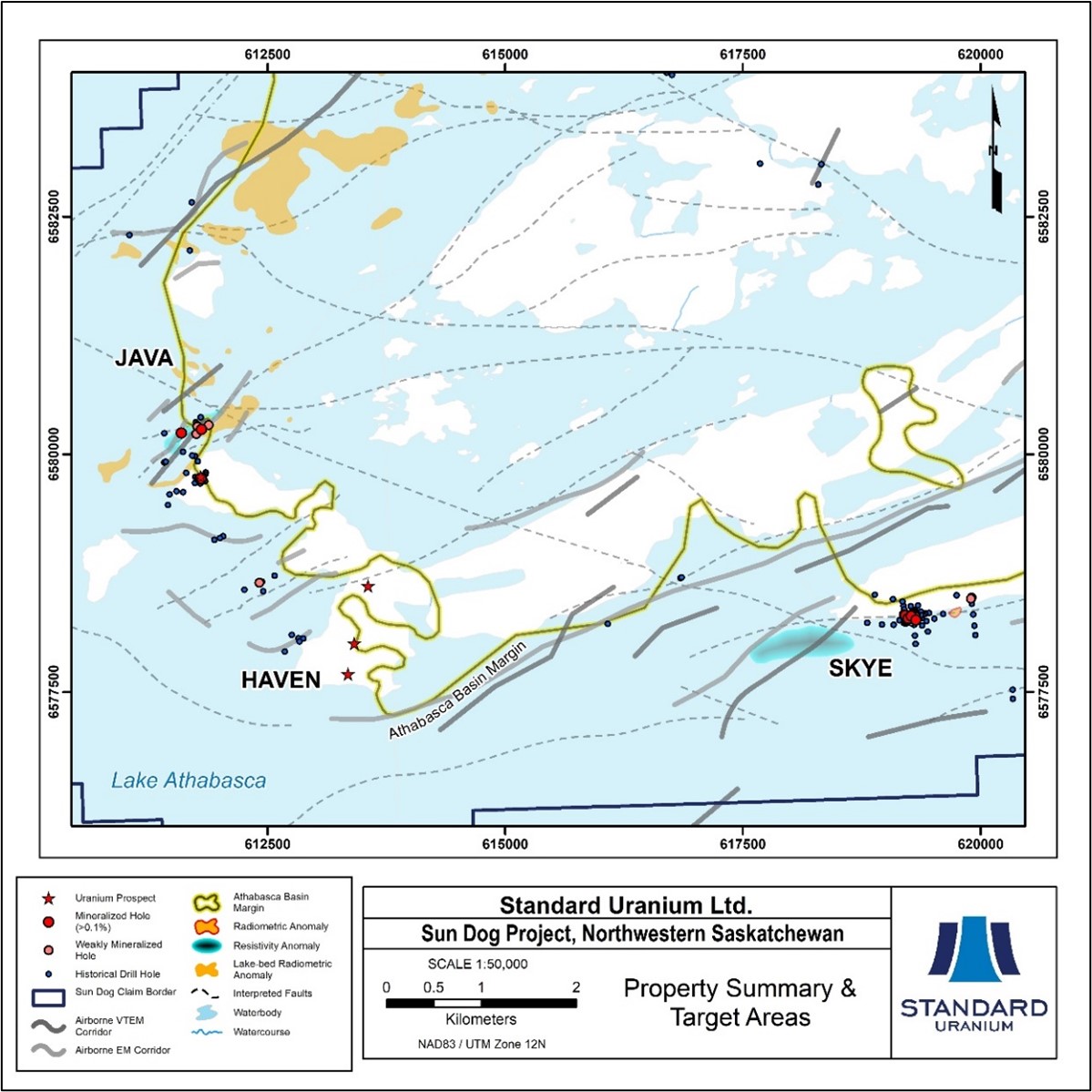 Standard Uranium's Sun Dog project, in the northwest part of the Athabasca Basin, Saskatchewan, is comprised of 6 mineral claims over 15,770 hectares. The Sun Dog project is highly prospective for basement and unconformity hosted uranium deposits yet remains largely untested by sufficient drilling despite its location proximal to uranium discoveries in the area.