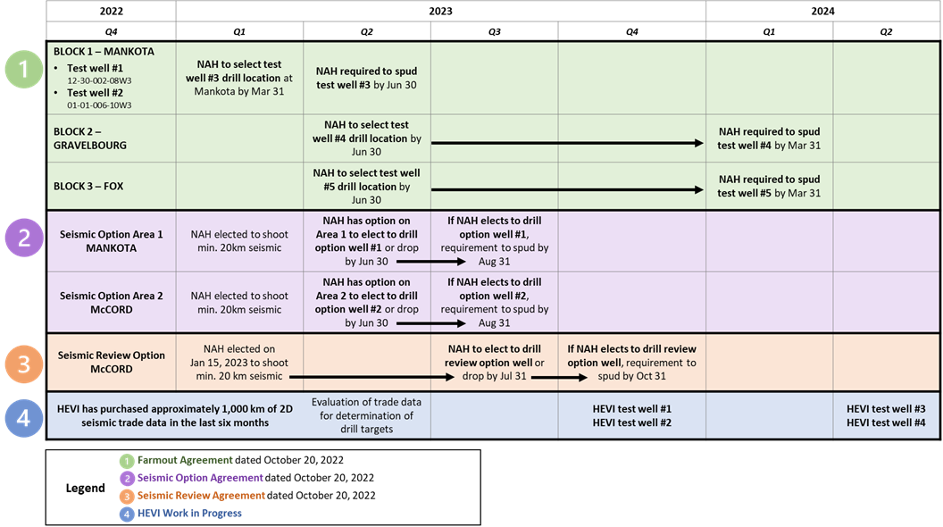 The key operational dates and catalysts pertaining to the Agreements with NAH are presented below, with certain future events predicated on past decisions as indicated. NAH currently has committed to a minimum of five, and up to eight potential wells that can be drilled and will be fully funded by NAH, along with the shooting and review of additional seismic data. These milestones and catalysts are supplemented by HEVI’s internal activities related to exploration of the Company’s 100% working interest lands, financial reporting and other corporate updates.